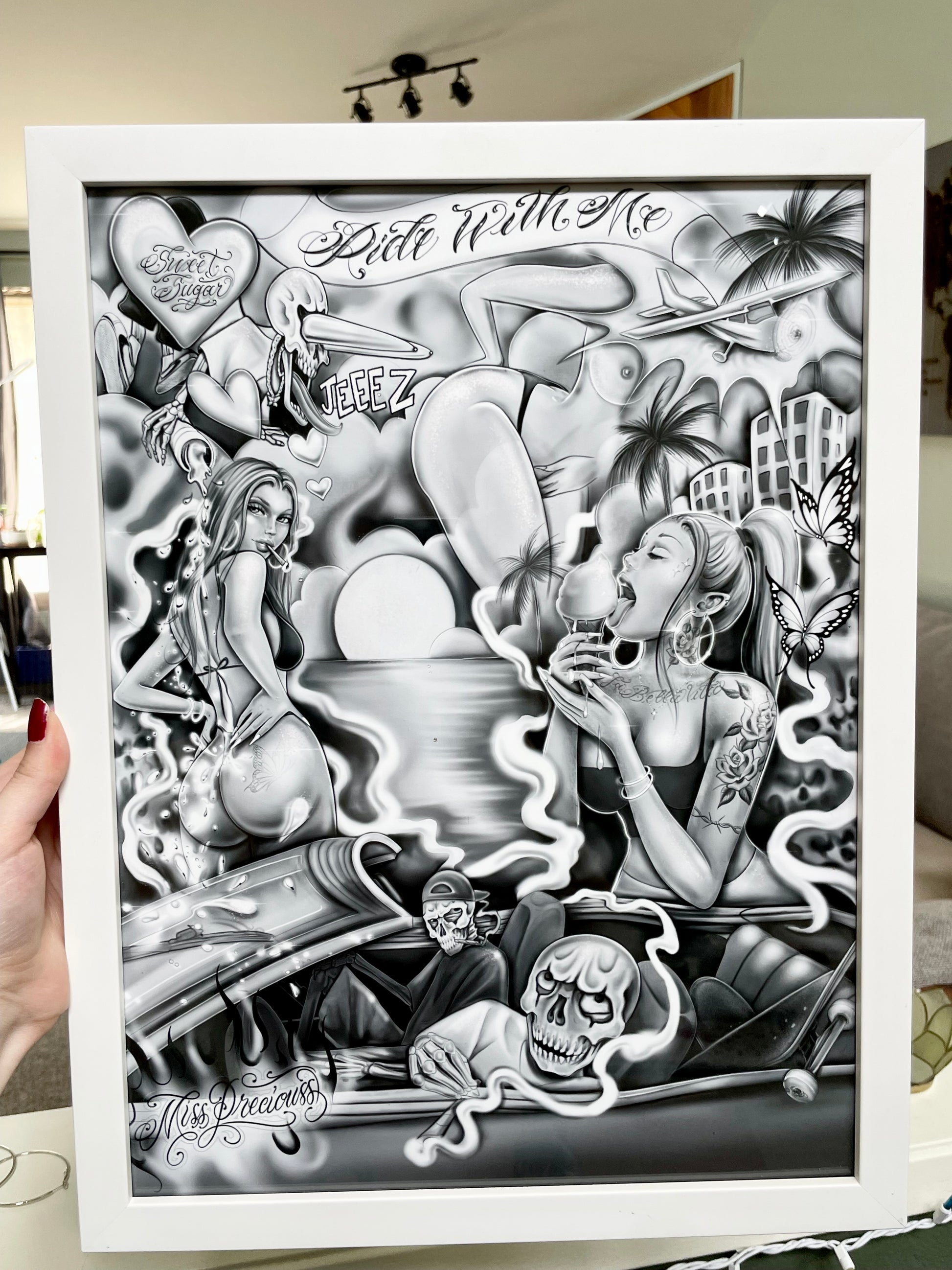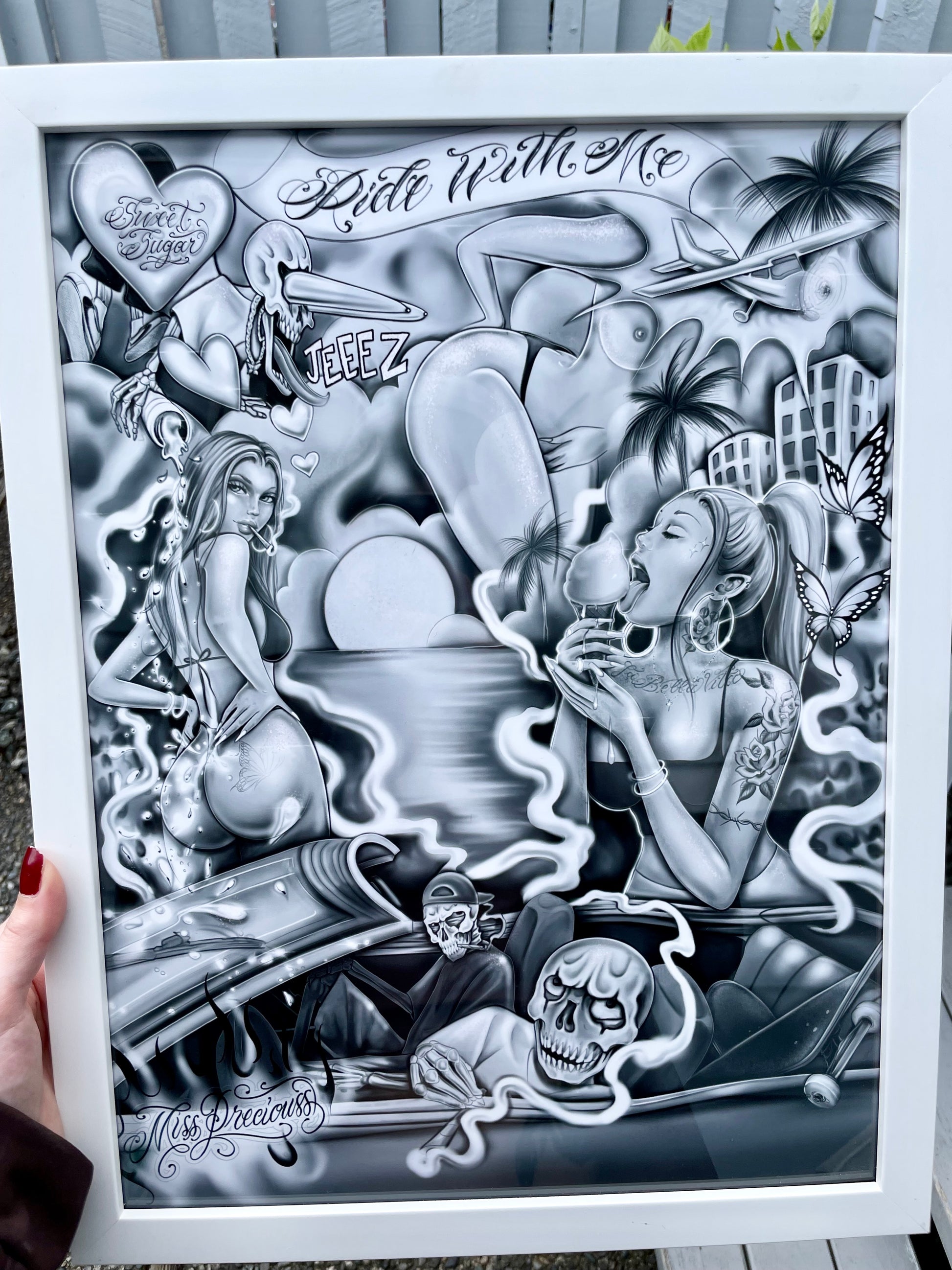 This artwork features two carefree women: one seductively licking an ice cream, the other radiating heat in a bikini. Cruising by, two skeleton dudes roll through in a classic ride, joints lit, eyes locked—drawn to the allure.